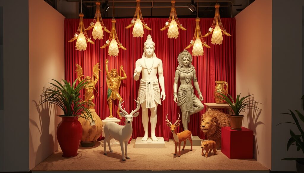 इस वीडियो की शुरुआत होती है ट्रेंडिंग आइटम सिंहासन से। यहां पर एक नहीं, बल्कि दस से ज्यादा डिजाइन के सिंहासन रखे हुए हैं। सबसे खास बात यह है कि ये सारे सिंहासन फोल्डेबल हैं, यानी इन्हें आसानी से सेट और पैक किया जा सकता है।